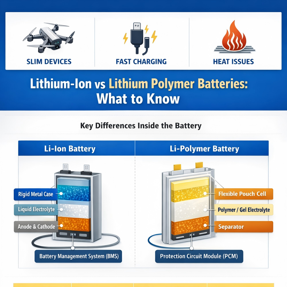 We use batteries every day. Phones, wearables, drones, tools, power banks. Still, battery choice feels confusing for many buyers. This guide explains lithium ion vs lithium polymer in a simple, practical way. We focus on real tradeoffs. No marketing fog. You will learn how a lithium polymer battery behaves in practice. You will also learn when a li polymer battery pack makes sense for your product.