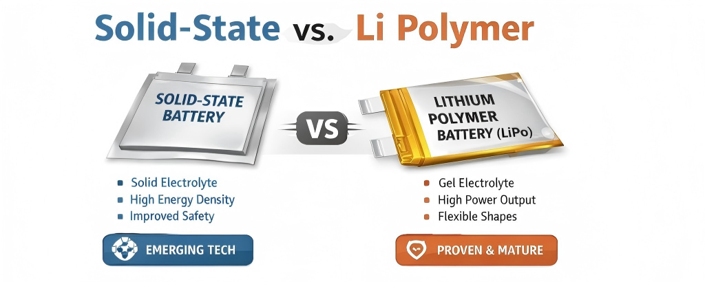 The electrolyte type is the main difference. A lithium polymer battery usually uses liquid or gel electrolyte in a pouch format. Solid-state uses a solid electrolyte layer, which changes interfaces, manufacturability, and safety behavior.