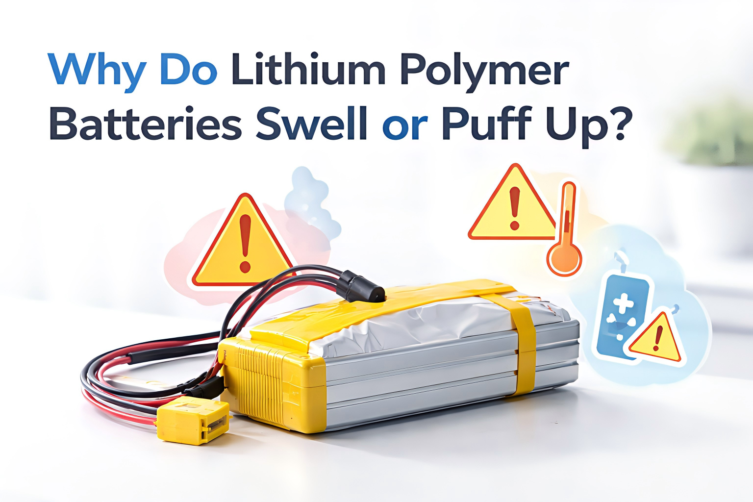 Lithium polymer batteries swell when gas builds up inside the pouch cell. This usually happens because of overcharging, over-discharging, heat, aging, internal short circuits, or physical damage.
